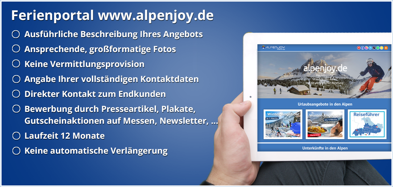 Ferienportale gibt es wie "Sand am Meer"! Mit www.alpenjoy.de gibt es aber nur ein gut verlinktes und optisch sehenswertes Ferienportal für die Alpen, über das Sie Buchungsanfragen erhalten, aberMehr Info zur Onlinewerbung