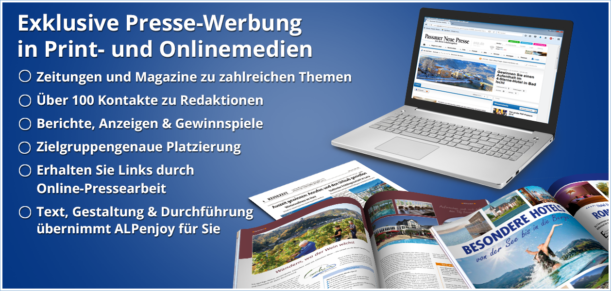 Streuverluste waren gestern! Schalten Sie eine Anzeige im innovativen ALPenjoy Ferienkatalog "Urlaub von der See bis in die Berge", dessen Verbreitung durch die direkte Verteilung an die Zielgruppe auf zahlreichen Messen sichergestellt ist.Mehr Info zum Katalog