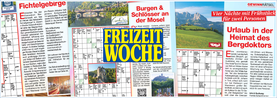 die Freizeitwoche informiert ihre bodenständigen und neugierigen Leserinnen ab 45 Jahren nicht nur mit spannenden Promigeschichten und Inhalten aus den Bereichen Food, Medizin und Ratgeber. Zu den Highlights jeder einzelnen Ausgabe der Zeitschrift zählt auch der opulent gestaltete und hoch informative Reiseteil, der wöchentlich 480.000 Leser/innen begeistert. Ob Mexiko oder das Allgäu: Hier werden Reiseziel „hollywoodreif“ in Szene gesetzt.