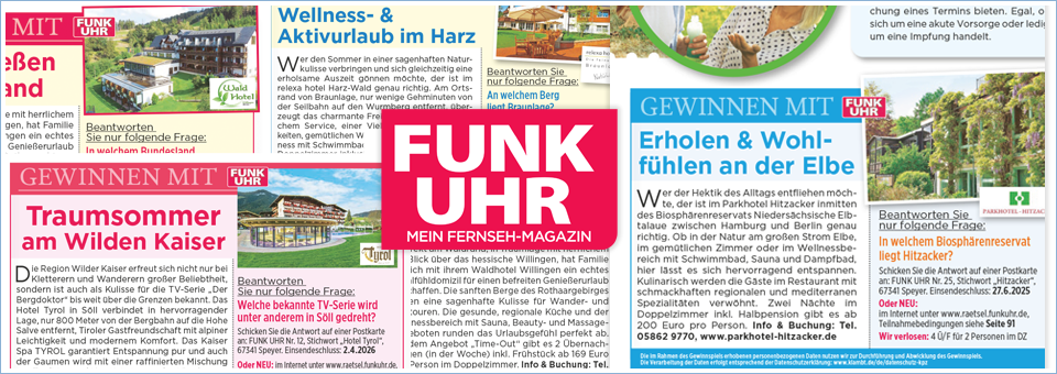„FUNK UHR“ ist das Fernseh-Magazin, das durch eine kompetente Berichterstattung und durch die thematische Ausrichtung in erster Linie Frauen anspricht und dennoch auch von Männern gern und intensiv genutzt wird. Rund um das ausführliche TV-Programm bietet der Mantelteil von „FUNK UHR“ Schwerpunktthemen wie Gesundheit und Wellness, Hintergrundinformationen und aktuelle News zu Ernährung, Mode, Beauty, Partnerschaft und Familie, Tipps zu Geld, Recht und Haushalt.