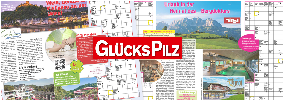 Für alle, die gerne Rätsel lösen, bietet der GlücksPilz eine Kombination aus einem bunten Rätselmix und attraktiven Gewinnen. Die immer wiederkehrenden Standardrätsel bestimmen das Bild des Heftes und sorgen, neben den Preisrätseln, für extra Ratespaß. Hier findet man Rätsel zu den Kategorien Geografie, Humor sowie Tier- und Pflanzenwelt. Immer am Start – das Promizitat, bei dem ein deutscher Promi vorgestellt wird. Genau das Richtige für eine treue Leserschaft, die eine Vielfalt an kniffligen Rätseln gewohnt ist.