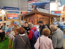 Hingucker des Messestandes ist u.a. eine rustikale Almhütte, die nicht nur als optischer Blickfang dient, sondern gleichzeitig als Lager für Prospektmaterial und persönliche Gegenstände der Aussteller genutzt wird.