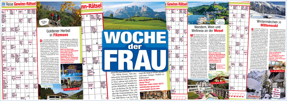 WOCHE der FRAU präsentiert sich in einer großzügigen Optik und mit pointierten Szenenfotos. Aktualität bestimmt die Auswahl der Prominenten: Das Foto der Woche – eine Momentaufnahme, die bewegt. Nachrichten der Woche – Highlights aus der ganzen Welt des Showbiz. Events der Woche – wo sich die Prominenz aus Film, Fernsehen und Sport trifft. People-Stories, Prominente zum Anfassen und Reportagen. Besonderer USP: Der Film-Roman mit Vorabfotos und der Astro-Guide. Der Service- und Beratungsteil lässt bei der Zielgruppe keine Wünsche offen.